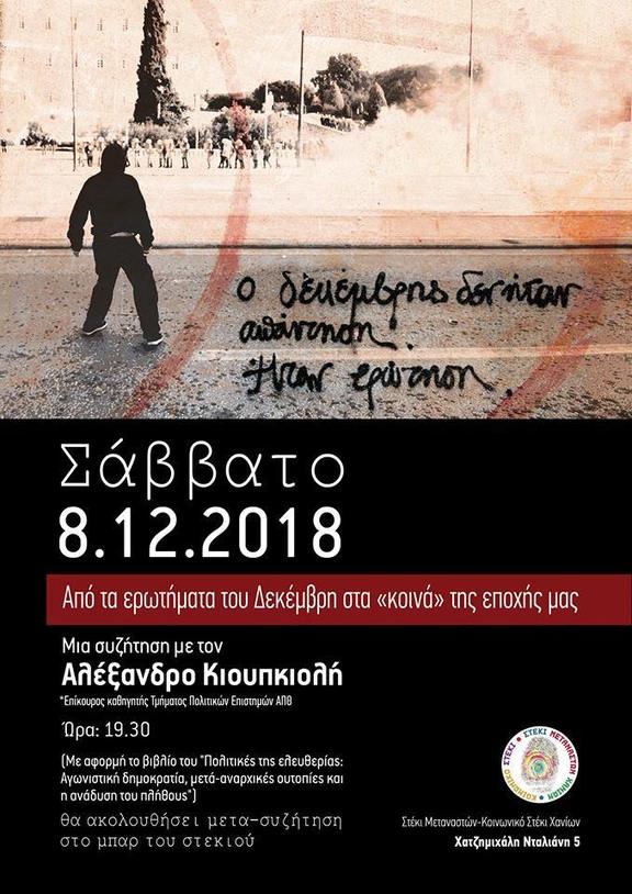 Tomorrow evening at 19:30, Alexandros Kioupkiolis will be a guest of the Refugee Center of Chania for a debate (spurred by the publication of his book ‘Politics of Freedom: Agonistic democracy, meta-anarchist utopias and the emergence of the multitude‘) on the significance of December 2008 and the commons of our time.