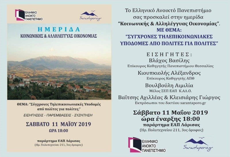 Heteropolitics researchers Alexandros Kioupkiolis and Aimilia Voulvouli will be speaking at the Social & Solidarity Economy (SSE) Conference on the “Modern Telecom Infrastructures by Citizens for Citizens” organized by the Greek Open University and Sarantaporo.gr in Larissa on May 11, 2019. Here’s more information (in Greek) about the event: https://www.eap.gr/el/anakoinvseis-ekdilwseis/sunedria-ekdilwseis/ekdiilwseis-tou-eap-fwtografiko-arxeio/7490-imerida-k-al-o-tou-eap-sti-larisa-me-thema-sygxrones-tilepikoinoniakes-ypodomes-apo-polites-gia-polites