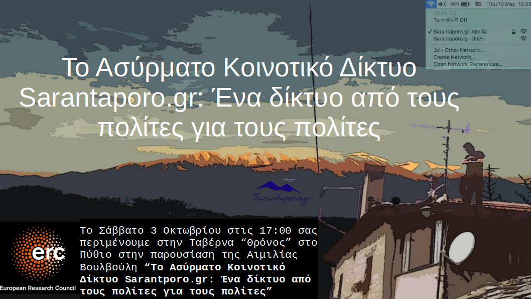 Το Σάββατο 3 Οκτωβρίου στις 5 το απόγευμα, θα πραγματοποιηθεί παρουσίαση της έρευνας της Αιμιλίας Βουλβούλη σχετικά με το Ασύρματο Κοινοτικό Δίκτυο Sarantaporo.gr στην ταβέρνα “Ο Θρόνος” στο Πύθιο Ελασσόνας, ένα από τα χωριά που συμμετέχουν στο δίκτυο. Θα παρέχεται η δυνατότητα livestreaming από το κανάλι των Ετεροπολιτικών στο youtube: https://www.youtube.com/
